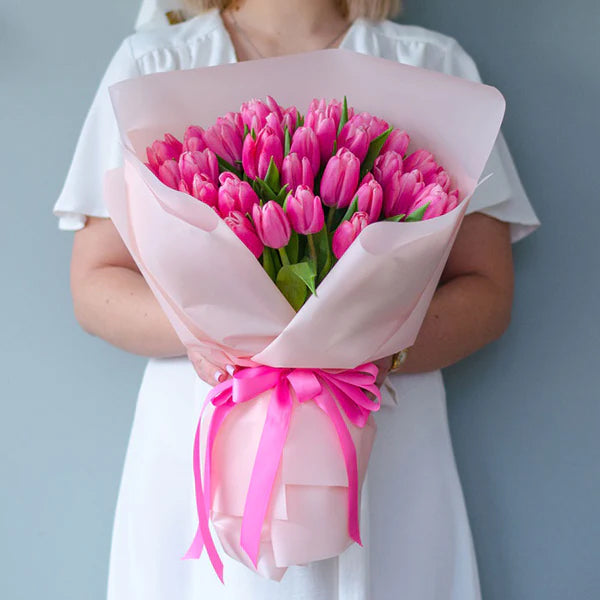 Celebrate Mother's Day with this exquisite 30 Pink Tulip Bouquet. Each beautiful tulip anticipates the approach of spring, representing love, adoration, and gratitude for your mother. These tulips, with their delicate pink hues, communicate feelings of appreciation and devotion, making them the ideal present to recognise the tireless sacrifices and unshakable love of mothers everywhere.
