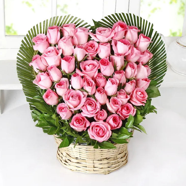 Heart-Shaped Arrangement of 50 Pink Roses in Basket